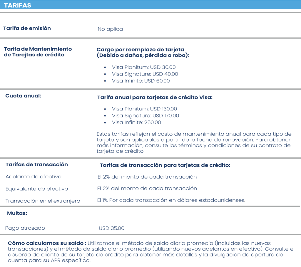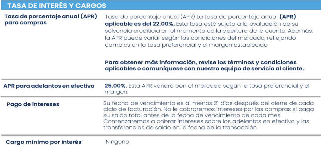Si corresponde, se reflejará un cargo anual en su primer Estado de cuenta posterior a la activación de la primera Tarjeta y, posteriormente, en cada aniversario de la emisión de dicha Tarjeta. Se proporcionará un aviso en su estado de cuenta antes de la fecha de renovación. Además, es posible que se apliquen cargos por pagos atrasados, tarifas de transacción, tarifas de configuración y otras tarifas a su tarjeta.